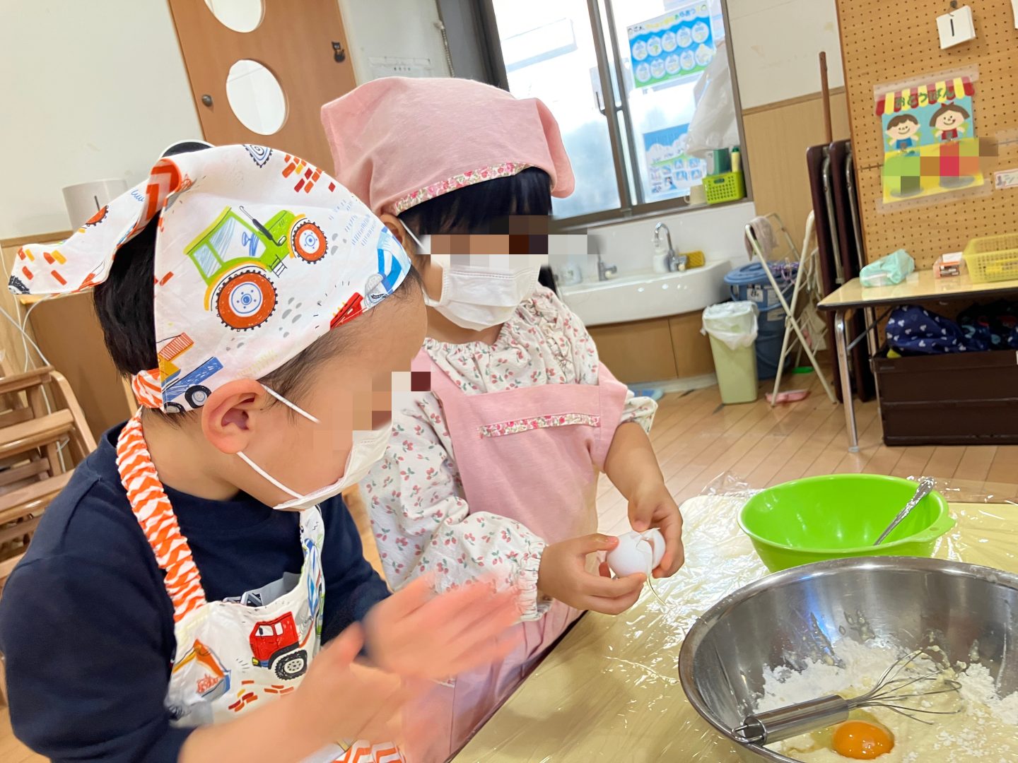 「ぐりとぐら」の絵本を見て、カステラが美味しそうと言っていたので、実際に作ることができて嬉しそうな子どもたち。