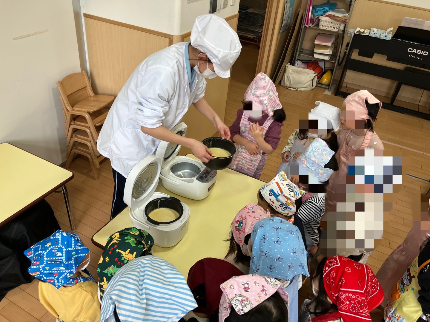 「美味しくなーれ!」と魔法をかけたら、給食室に行って炊飯器を預かってもらいおやつの時に取りに行きました!