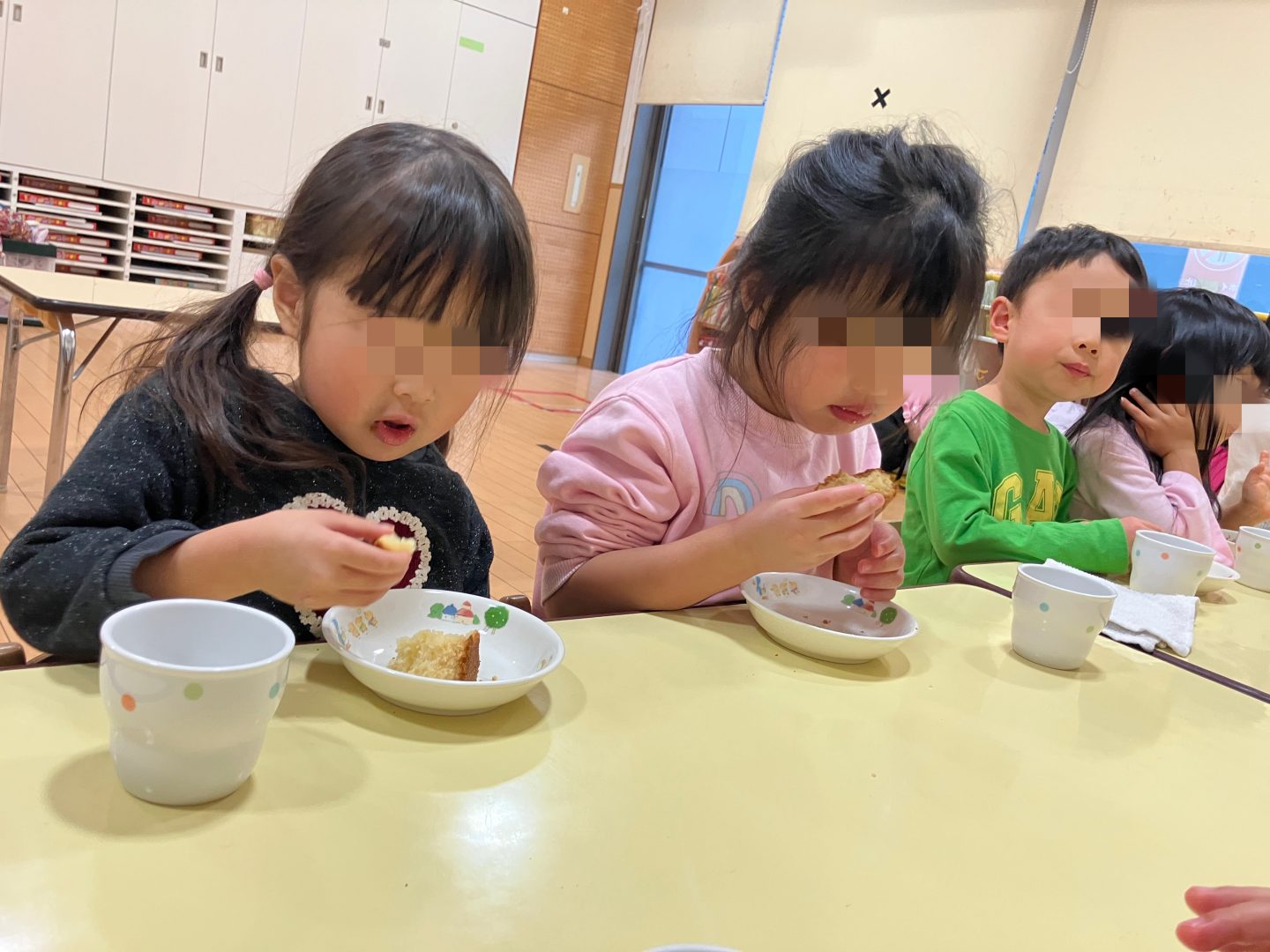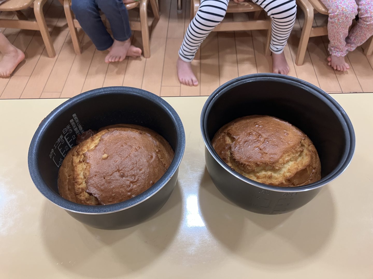 炊飯器を開けると美味しそうな匂いのカステラに「早く食べたい」と待ちきれない様子。先生が切り分けて食べると「おいしい!」と言いながら食べてあっという間に完食!