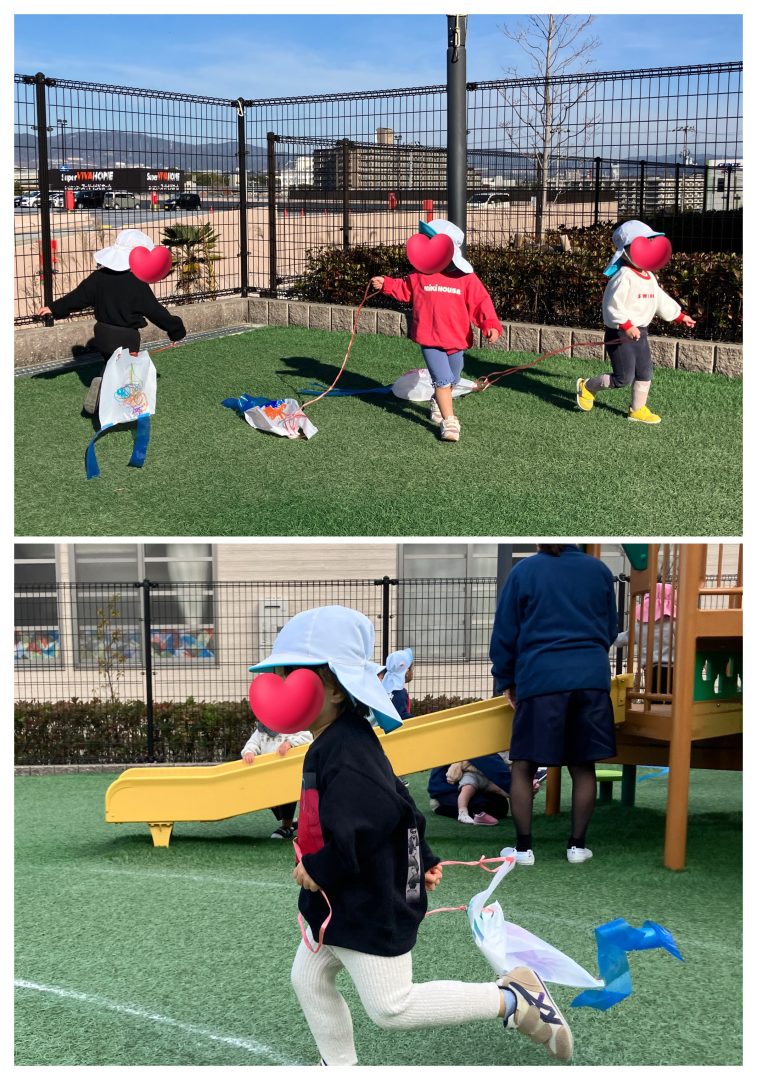 凧を作ったあとは、園庭で凧あげをしました。みんないい笑顔です。天まで届け!