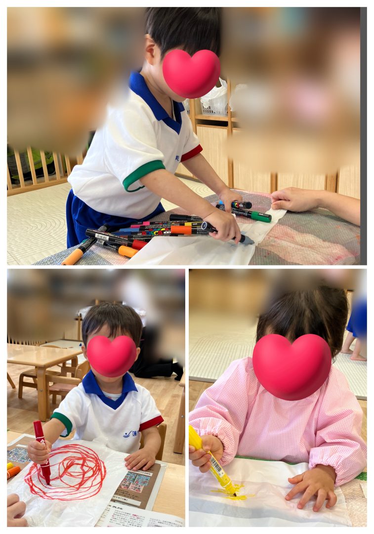 ビニール袋に絵を描いて凧を作りました。それぞれ好きなペンを使って思い思いに描いていきます。