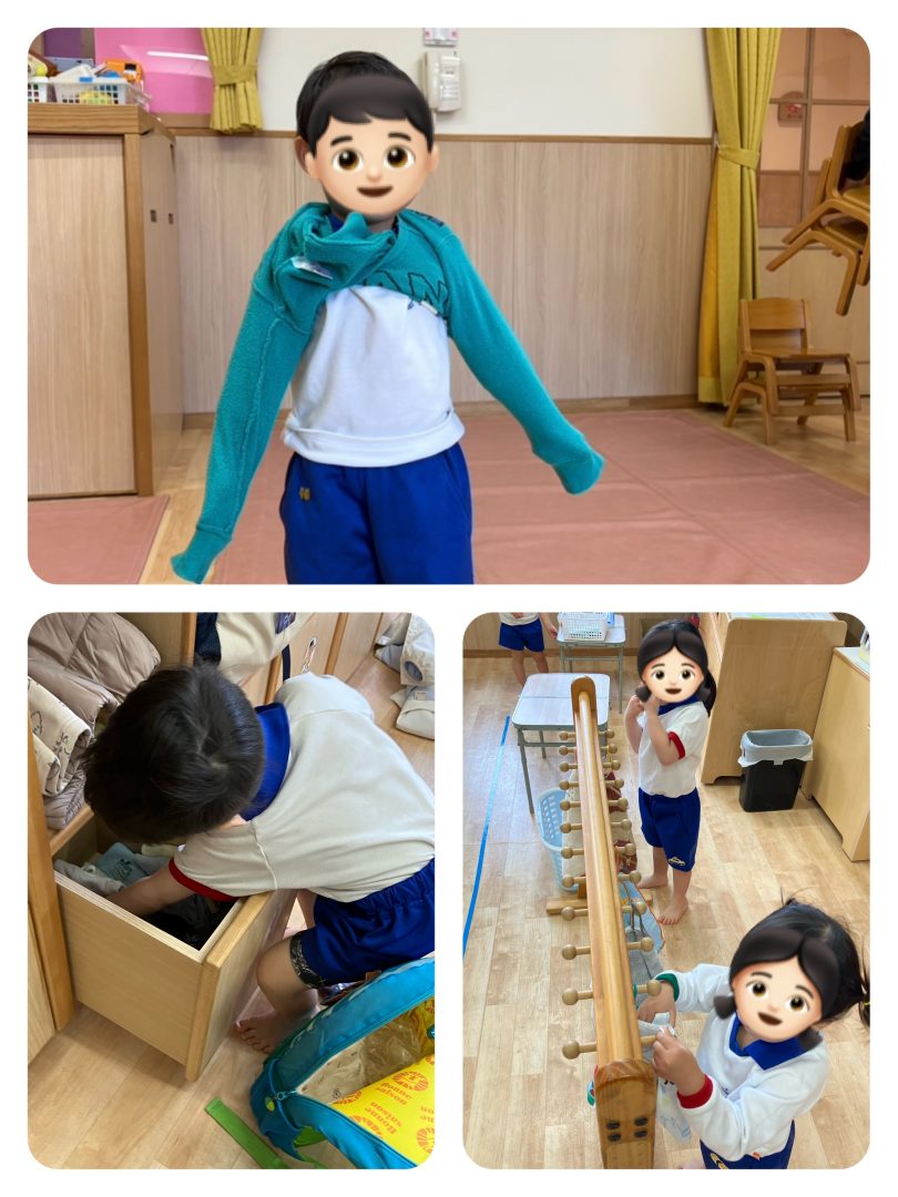 時々お着替えを頑張りつつも「変な事になった〜。」と見せにきてくれる事もありますが、一生懸命取り組んだ証が洋服に現れていたり、子どもたちの頑張りが見えて嬉しい気持ちになります⭐︎