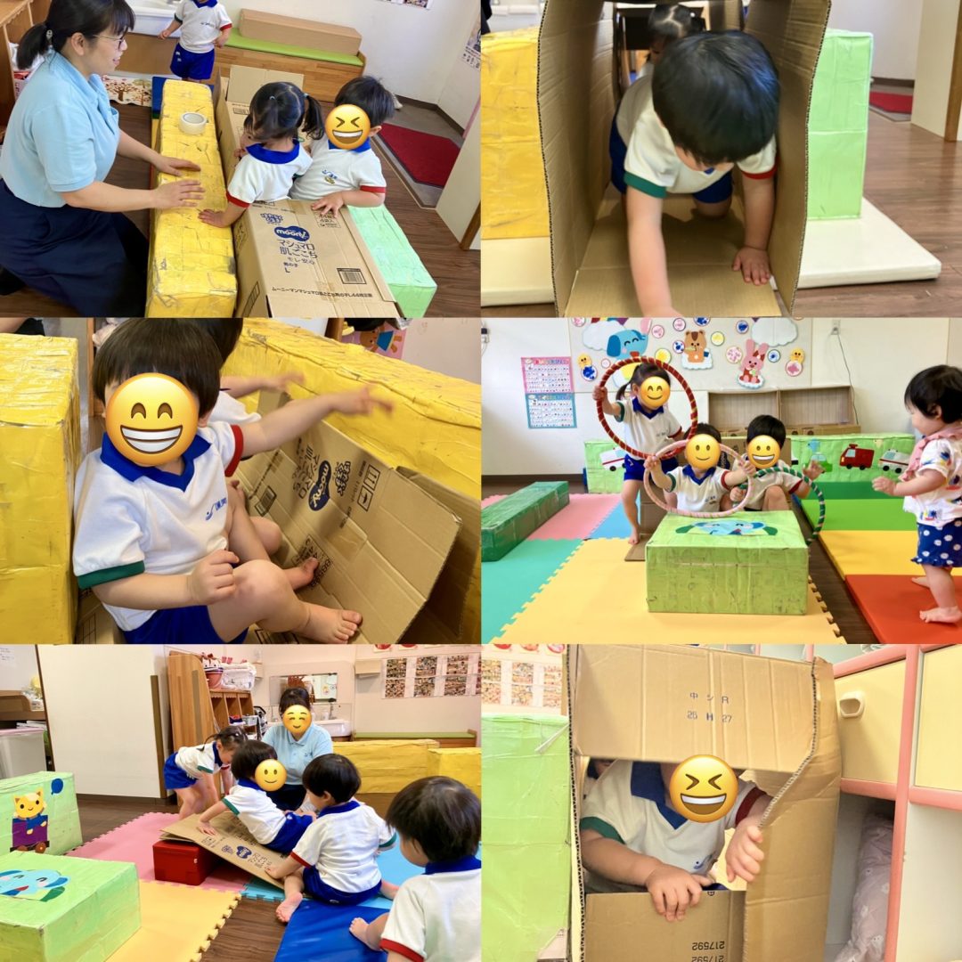 室内遊びではダンボールを使って遊ぶことがブームです。くぐってみたり、隠れてみたり、滑ってみたり、車に見立てて運転したりとさまざまな遊びを楽しんでいます!
