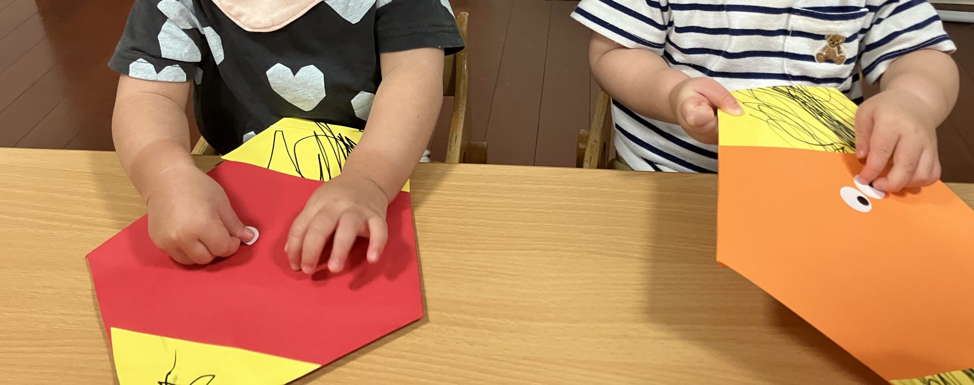 用意した豆入れの台紙に好きな色の花紙を選んで、花紙を丸めて髪の毛の部分に貼りつけたり、丸シールで目と頬をはりました。シール貼りも指先を上手に使えるようになってきました。
