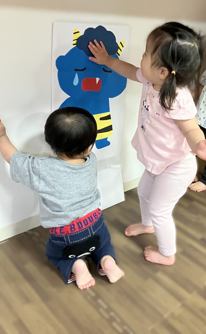 節分会当日は、いつもの雰囲気と違って泣いてしまう子もいましたが、保育者や友だちと一緒に豆まきに参加できました。いつも遊んでいる部屋に戻ってくると安心したようで、豆まきの鬼の的と仲良く遊ぶ可愛い姿が見られました。