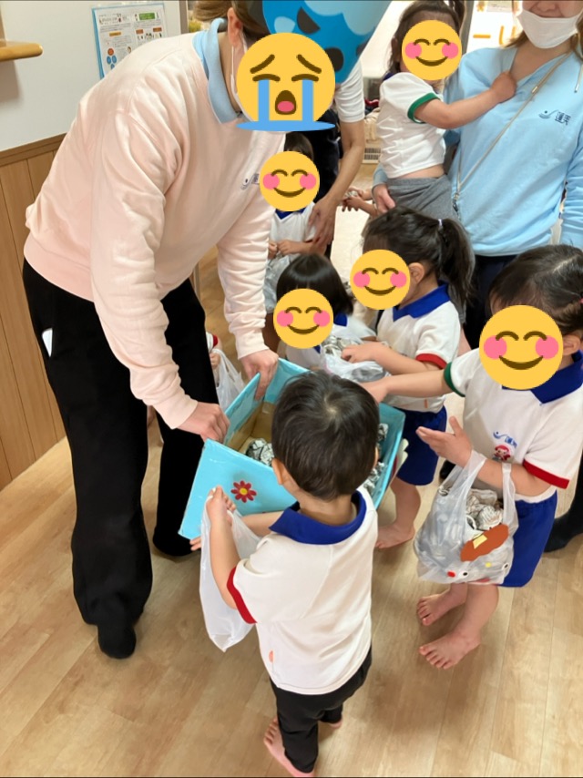 みんなで豆まき(豆入れ)をして、先生の心の中にいる泣き虫鬼をやっつけてあげることにしました!