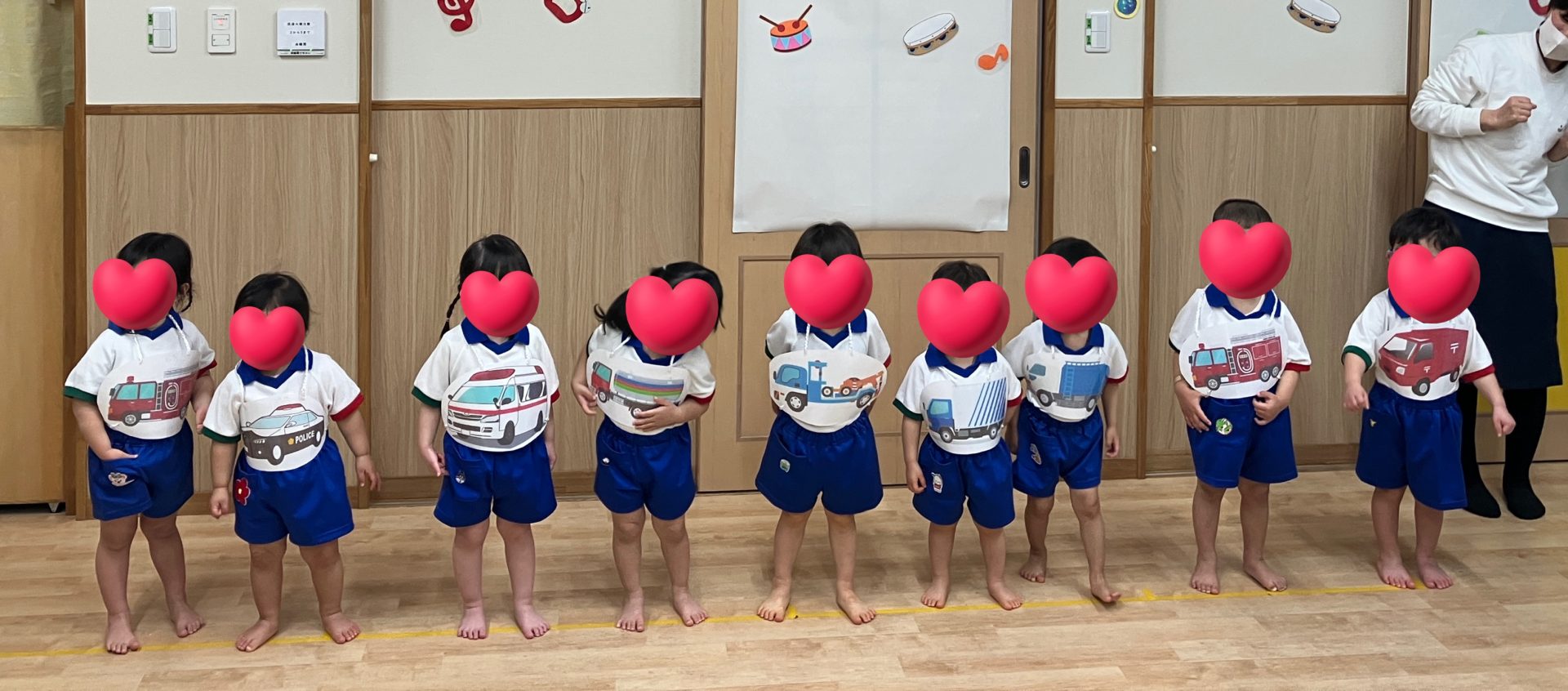 その後は1・2歳児で「はたらくくるま」を歌いました。好きなくるまを身に付けて登場!