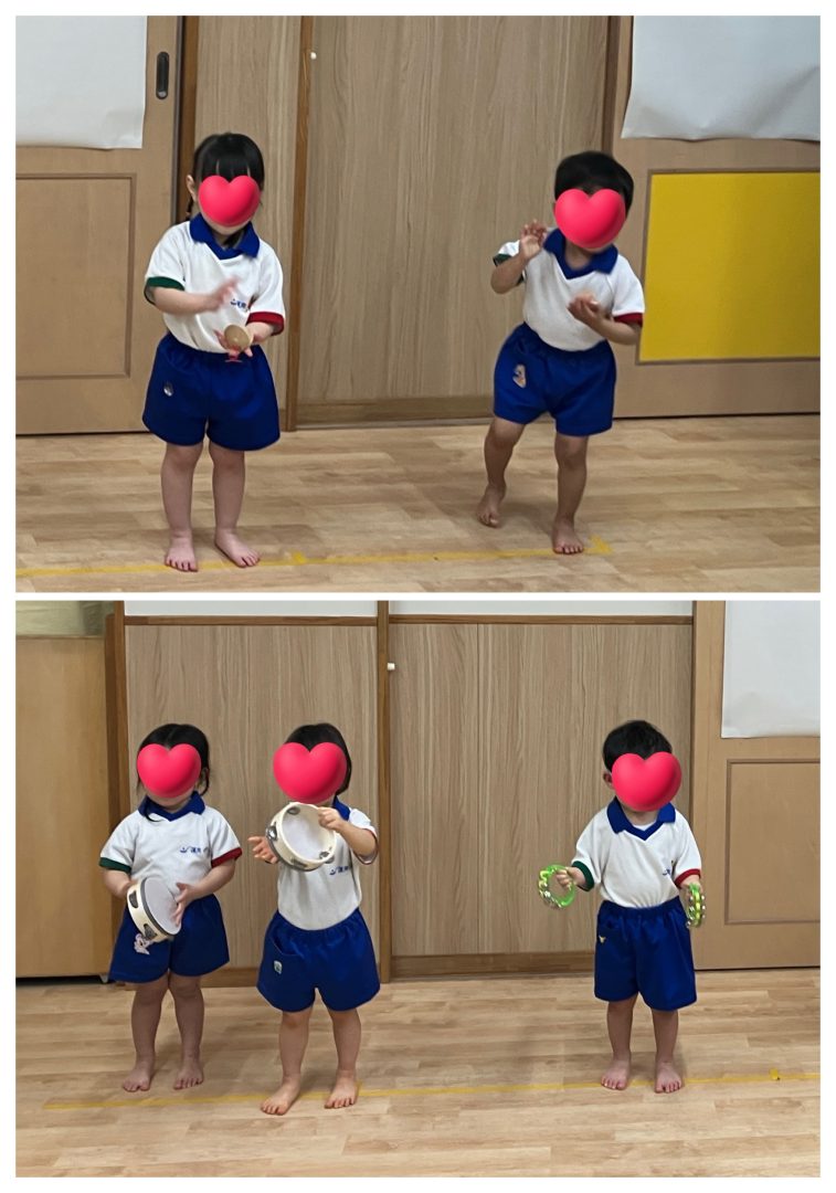 最後は2歳児による合奏です。ミッキーマウスマーチに合わせてタンバリン・鈴・カスタネットを演奏しました。たくさん、たくさん練習して・・・本番は練習以上の演奏ができました!!