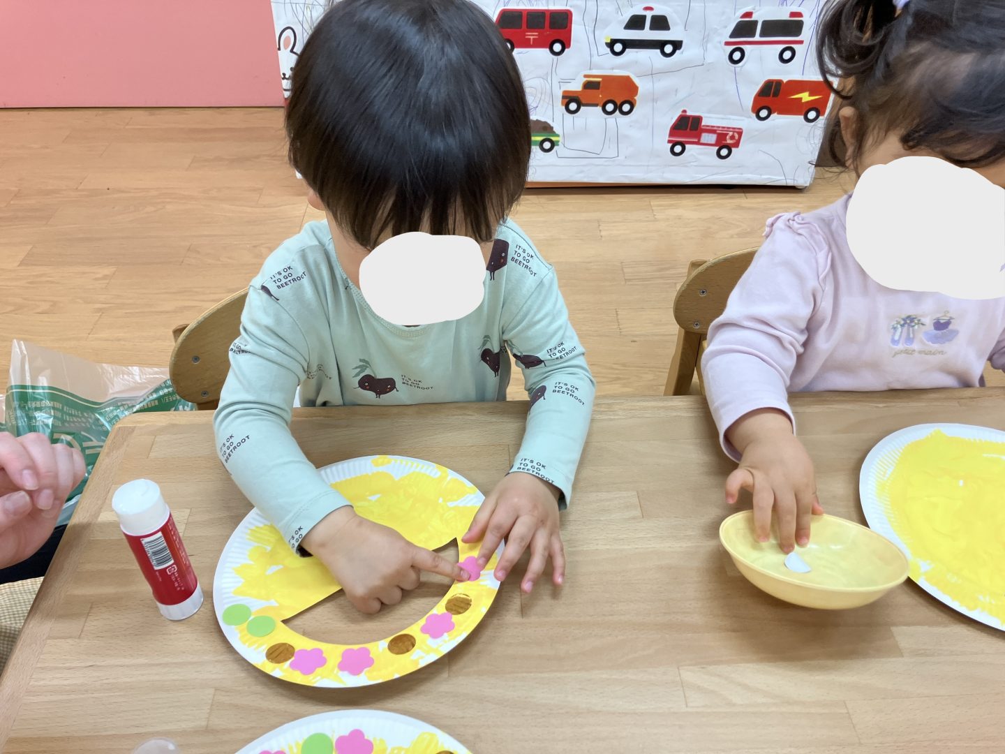 紙皿にスティックのりを使って自分で花などの飾りを選び、貼ります。
