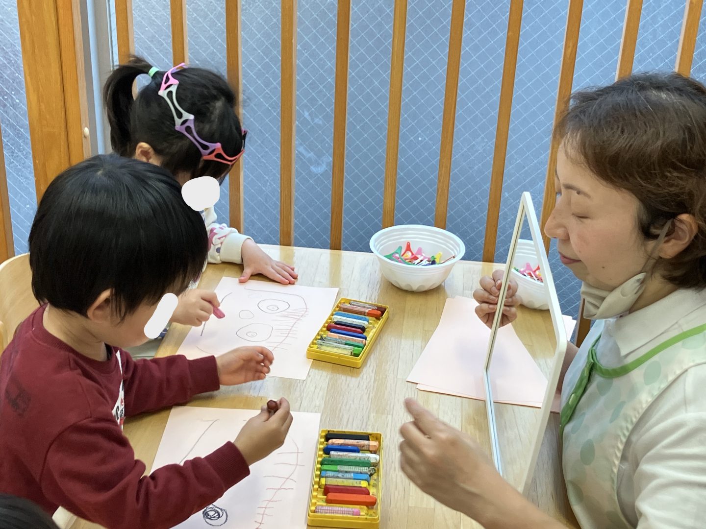 保育士の絵のお手本を見ながら、鏡で自分の顔を見て・・・