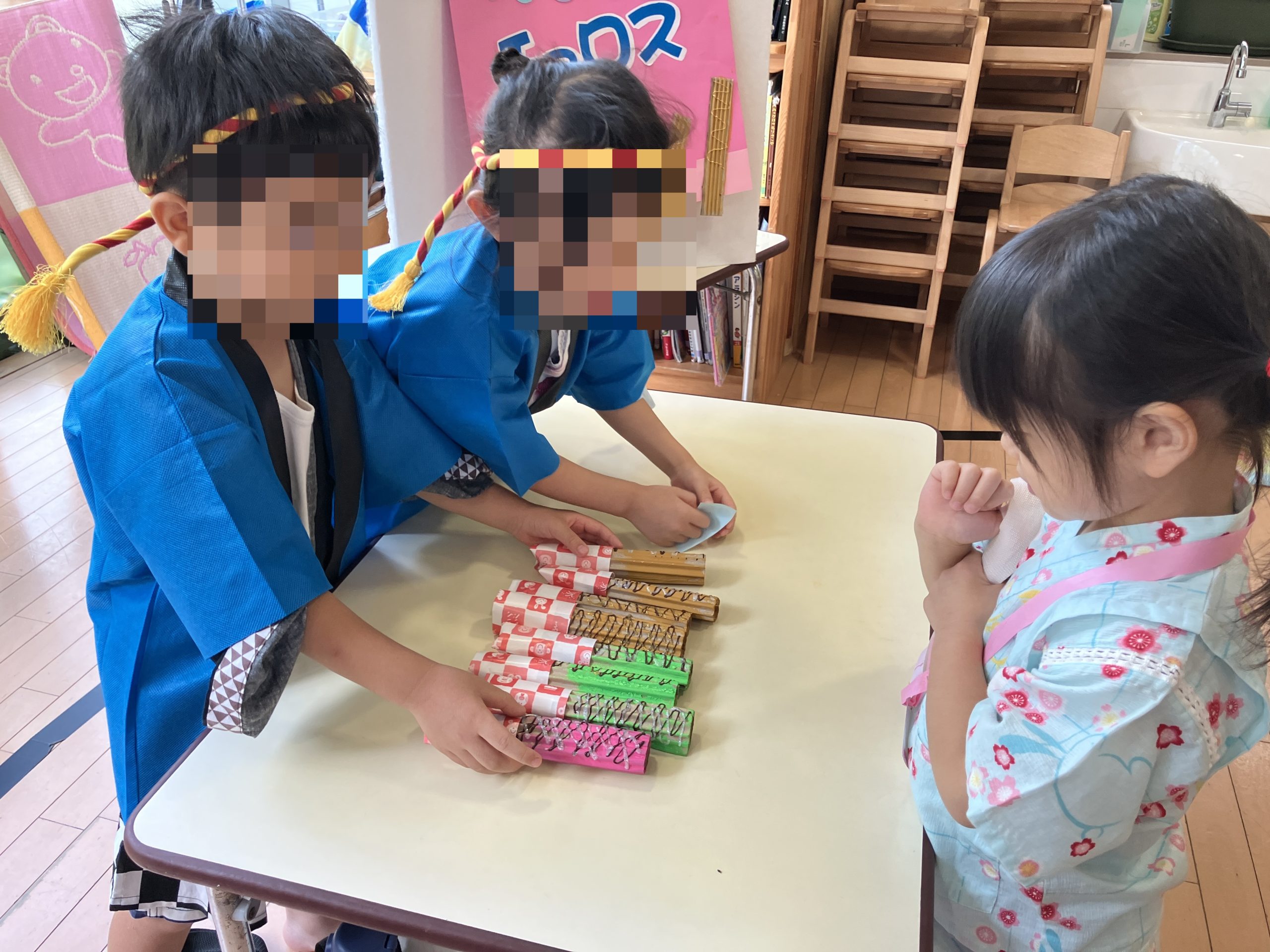 全クラスで製作したお店の商品を年長さんが店番をして販売しました!