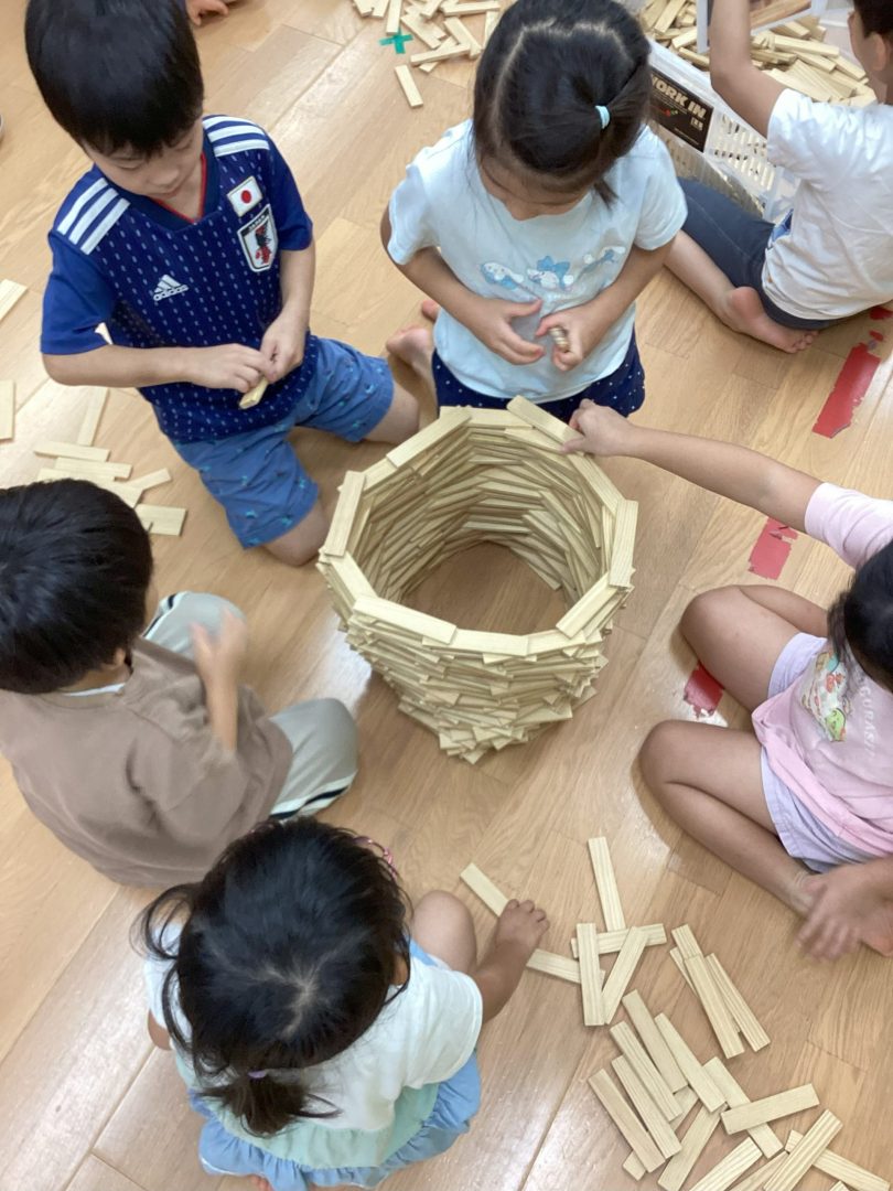 ぱんだ組さんは洗濯遊びが大好きです。「汚れたから洗うねー」と、タライで丁寧に布を洗ったり、洗濯バサミを使って干したりしています。「いっぱい洗濯物あって忙しいなあ」「しっかりシワ伸ばしてなー!」と、友達同士で厳しいチェックをし合っています!その姿がとっても微笑ましいです。