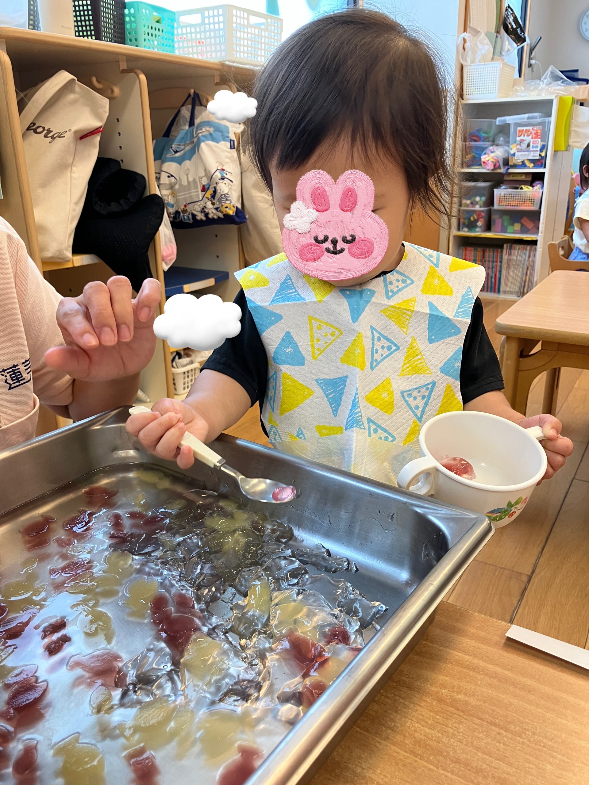 おやつは金魚の形のゼリーで、金魚すくいならぬ