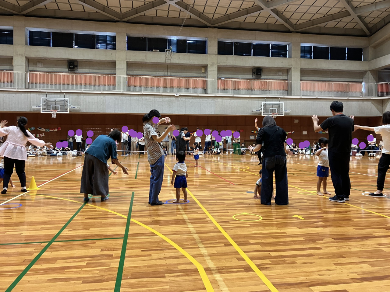 親子競技は、ぞう組は二人三脚、らいおん組は台風の目、きりん組、ぱんだ組はフープ取りゲームをしました。それまで緊張していた子どもたちも一気に笑顔になり、お父さん、お母さんと楽しそうに競技に取り組んでいました。
