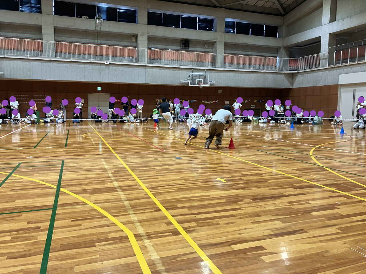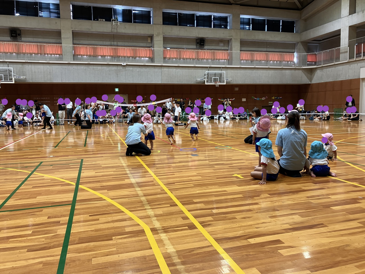ぱんだ組のかけっこでは、元気いっぱいお返事をして走れる子、泣いてしまう子それぞれみんな頑張っている姿に温かい拍手が贈られました。