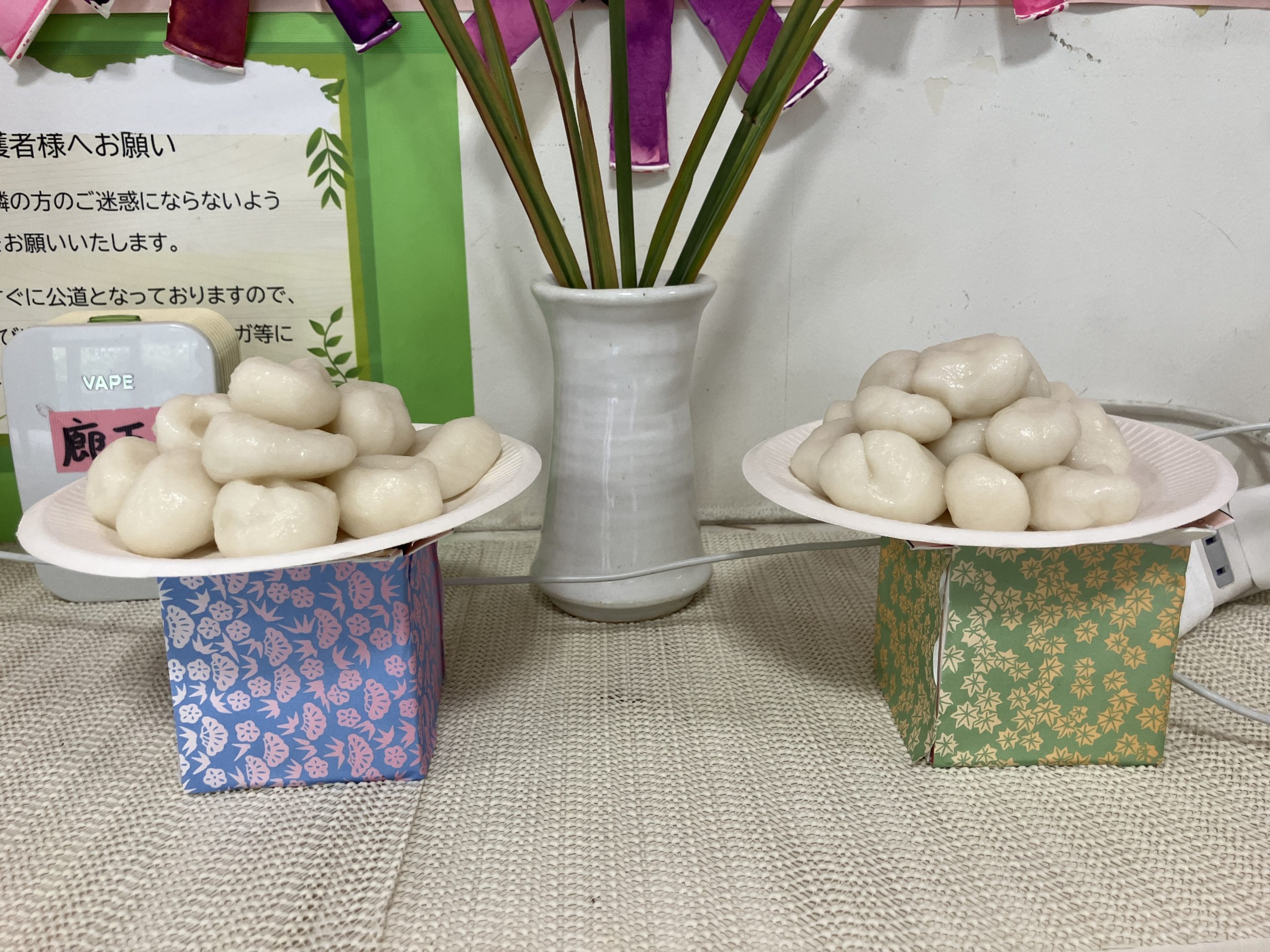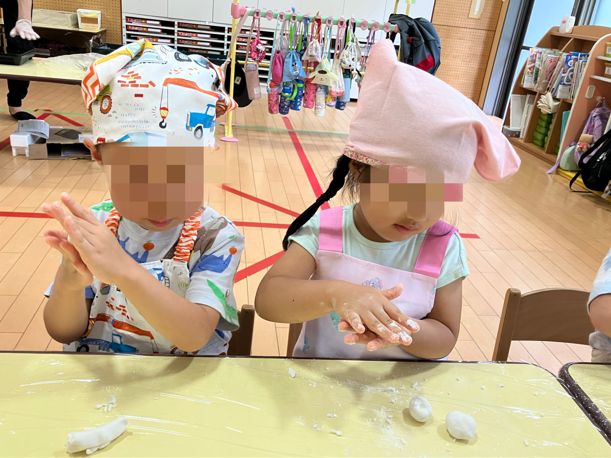 事前にクラスで丸める真似っこ遊びをしたことで、上手に満月のような丸いお団子ができました。