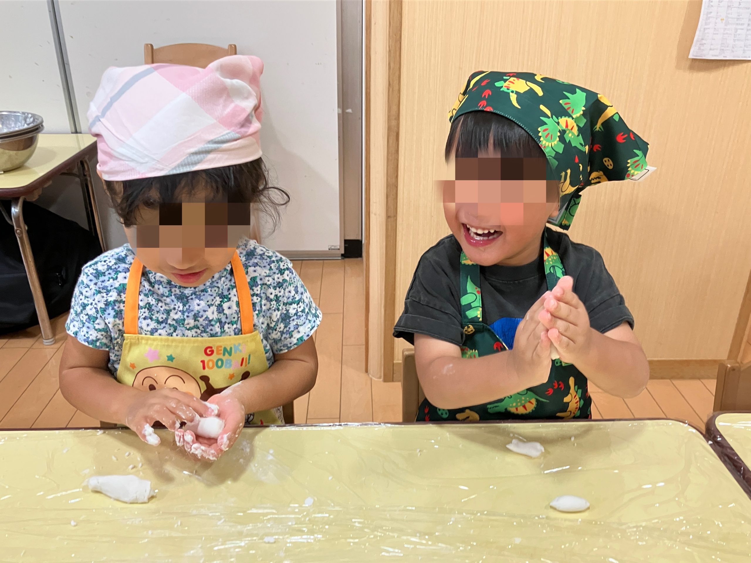 団子粉を触るとサラサラとした感触が気に入り、ダイナミックにかき混ぜて大喜びの子どもたち。水を入れて手で混ぜると手にくっついて面白がる子や嫌がり取ろうとする子など反応が様々でした。先生が仕上げにこねて大きなお団子のようになると大歓声で「早くやりたーい!」と待ち遠しい様子でした。