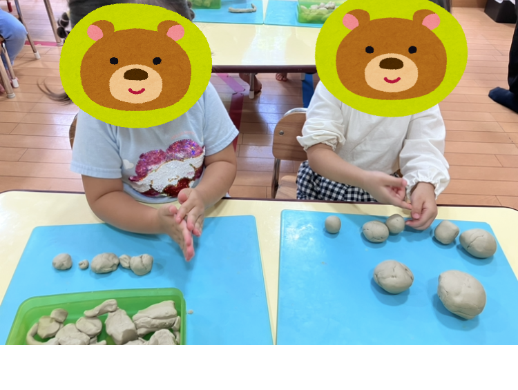 最初は手のひらの使い方が難しく、上手に丸められない子もいましたが、先生と一緒に丸めてみたり、見本を見て作ってみたりと挑戦していくうちにどんどん上達していました♪