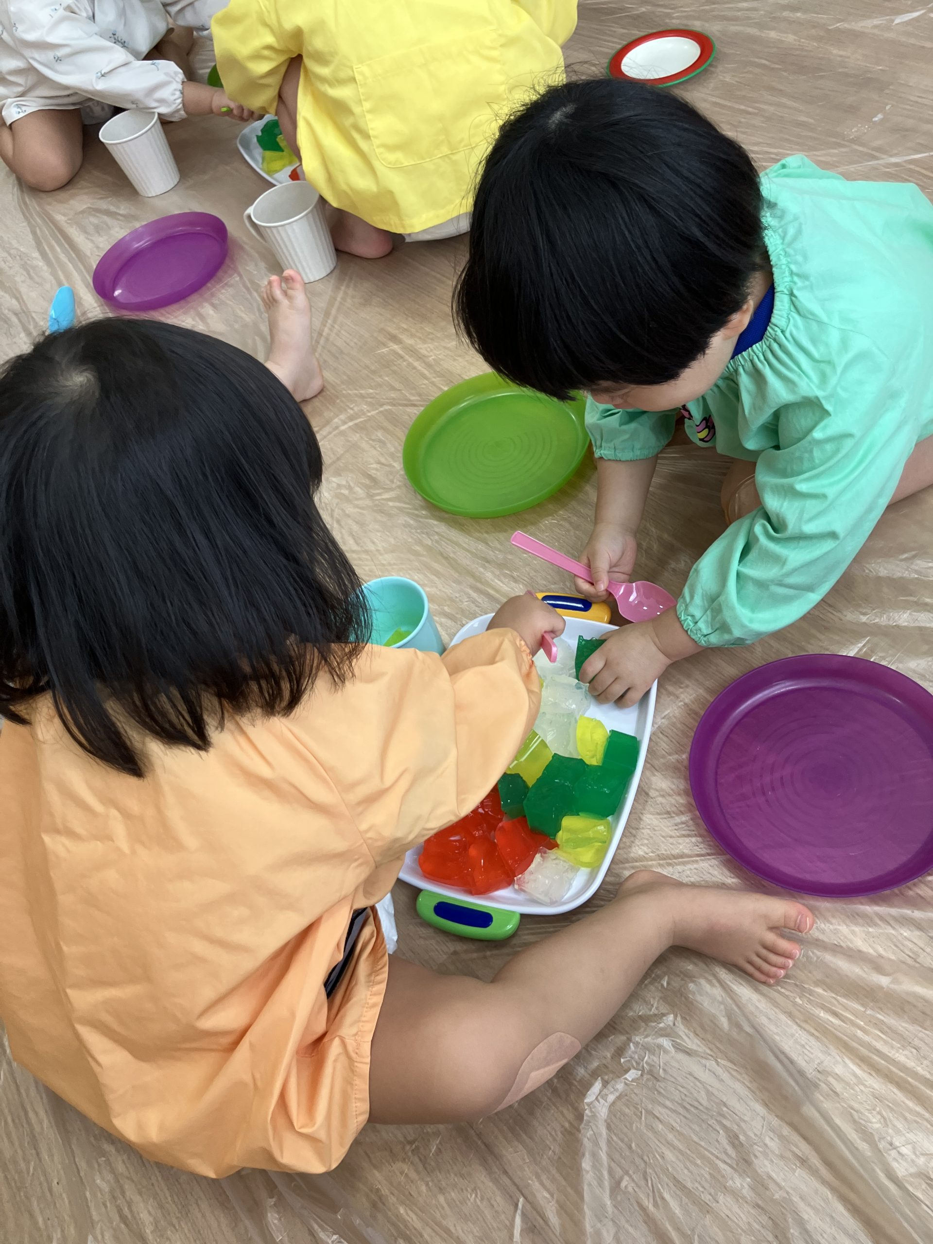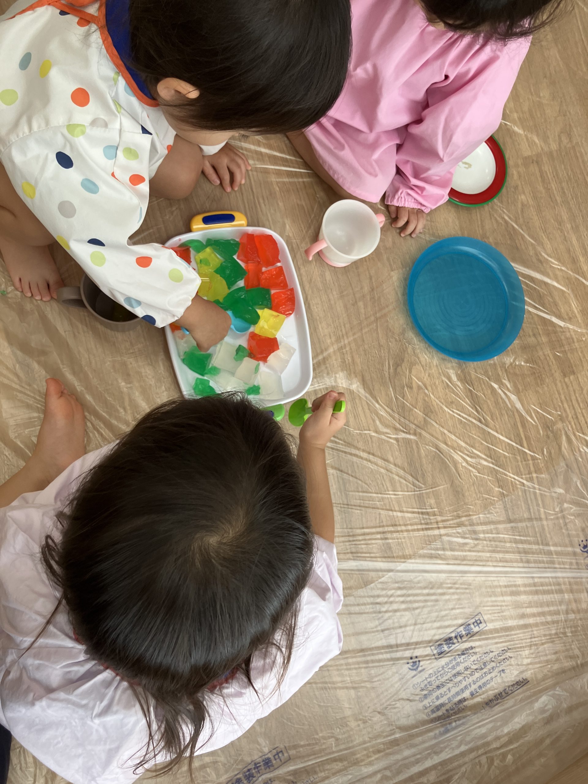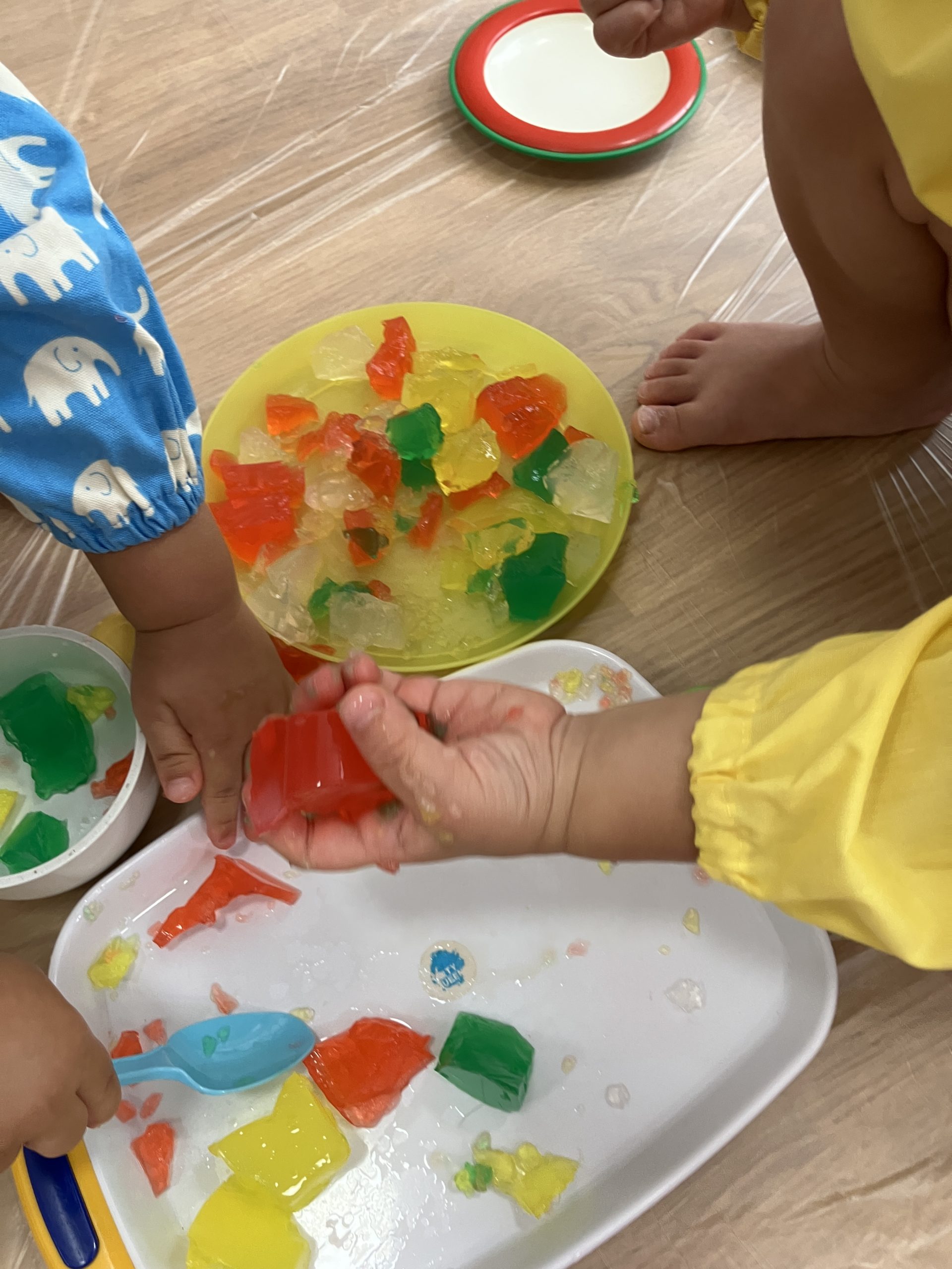 冷たくてキラキラしている寒天に大喜びなうさぎ組さんでした☺