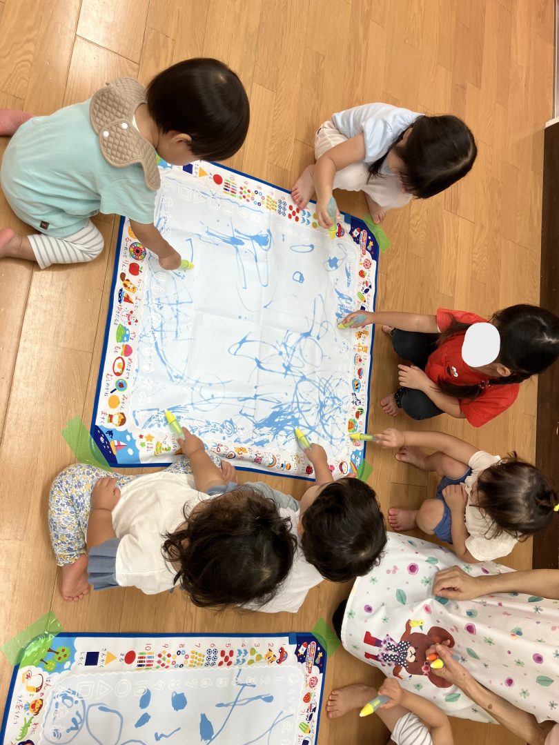 水でできるお絵描きコーナー、水で描けることを楽しむ様子が見られました。