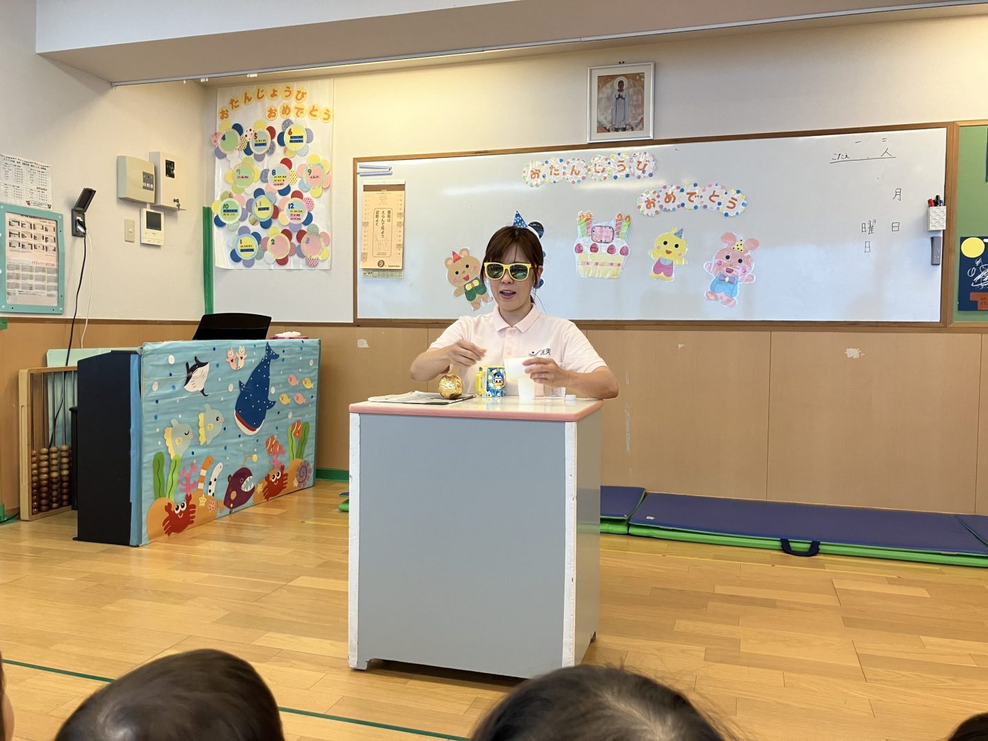 インタビューとお歌のプレゼントが終わると、あれ?先生が何かに変身!?