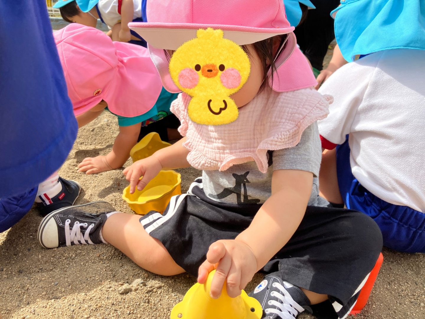 砂あそびが今ブームで砂場につくと早く遊びたいとみんな前のめりです。