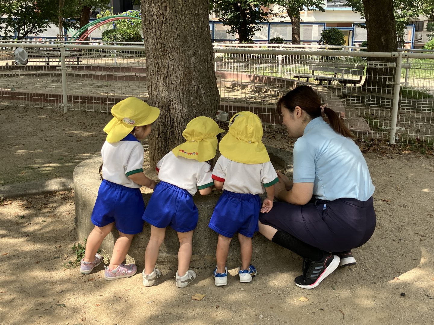 この木の下は定番のアリ探しスポットになっていて、「いたよ!」「どこどこー!?」「こっちにもー!」「ぼくが最初に見つけたよ!」と顔を寄せ合って盛り上がっています!