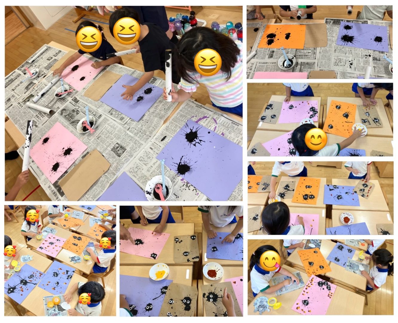 それから黒い絵の具を浸したコットンボールを棒で叩いてできた模様でまっくろくろすけを表現しました♪