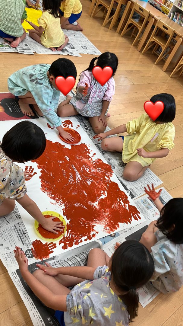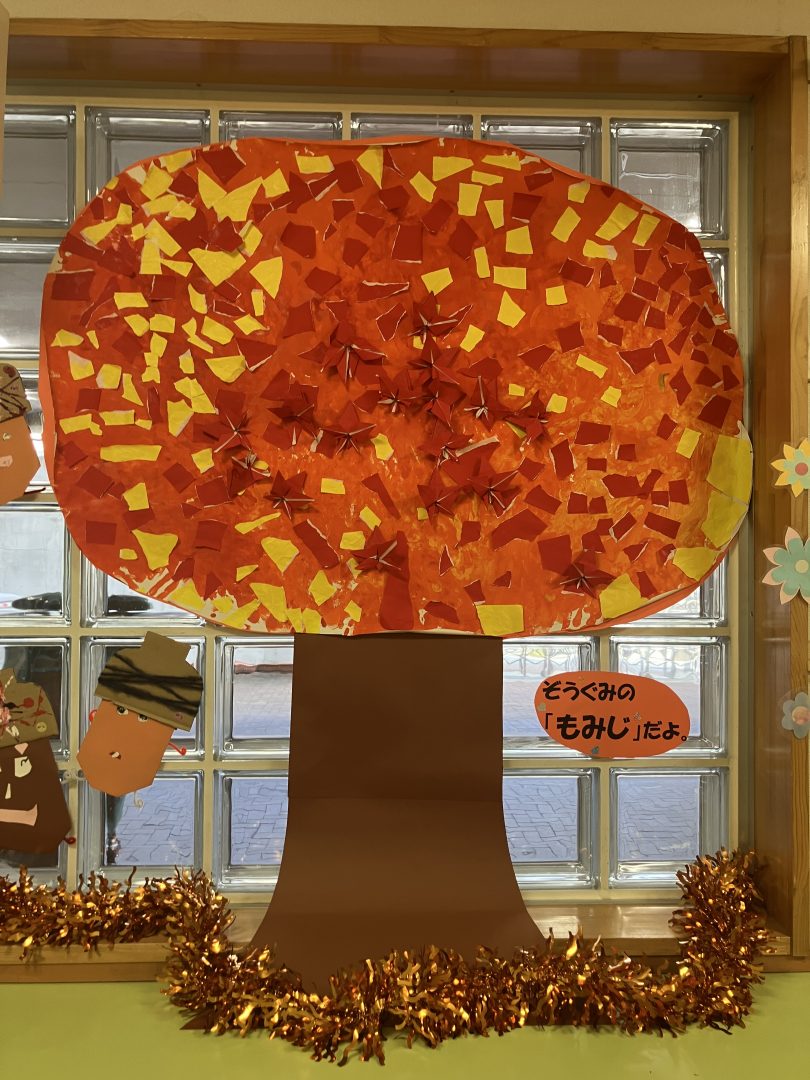 「絵の具であそびたい」と子どもたちからの提案があり、絵の具あそびをしました。 模造紙に手でペタペタと絵の具をつけて絵の具だらけになりながらあそびました。その絵の具あそびでできたものを使って後日の活動で紅葉の木を作りました。 絵の具のついた模造紙の上に折り紙をちぎってのりで貼りました。 色のバランスを見ながら貼ったのでとてもきれいな色合いになりました。 折り紙の時間に折った紅葉も貼り付けてきれいな紅葉の木になりました。