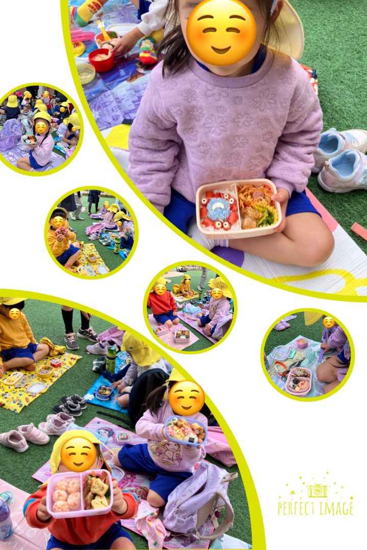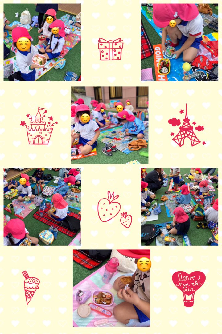 残念ながら、カラスが飛んでいたので現地でお弁当とはいきませんでしたが、園庭にピクニックシートを広げてお弁当を楽しみました。
