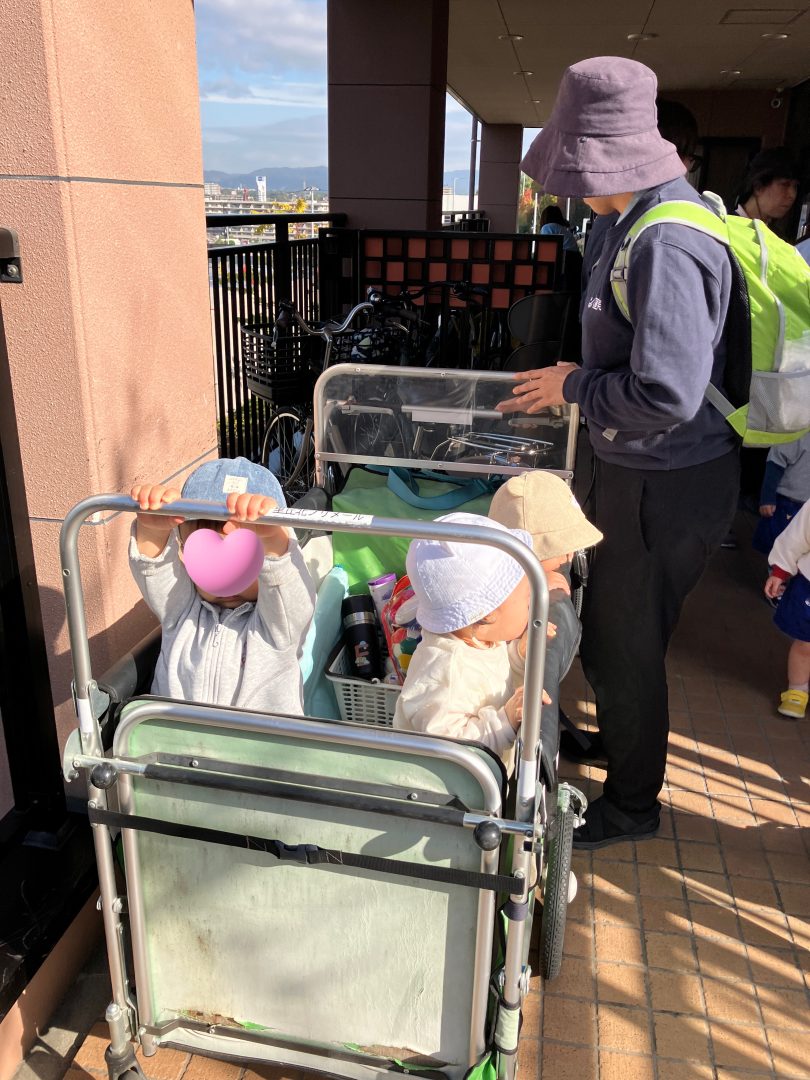 11月の秋晴れの日に遠足に行きました。近くの公園までレッツゴー!1・2歳児さんはお散歩リングや先生と手をつないで、0歳児さんはカートに乗って出発です。
