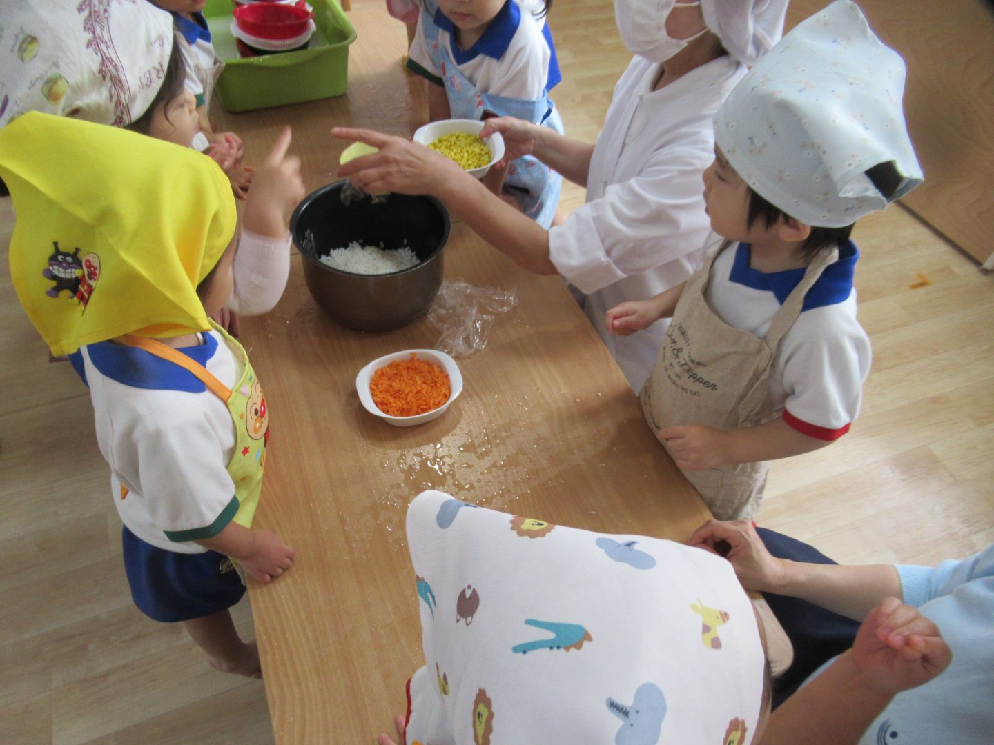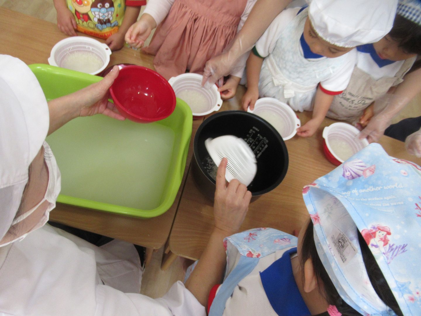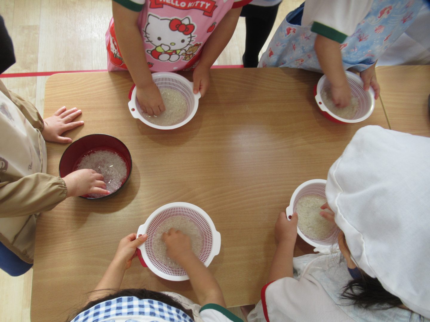 今月の食育は、ぱんだ組のみんなにお米をといでもらいました。