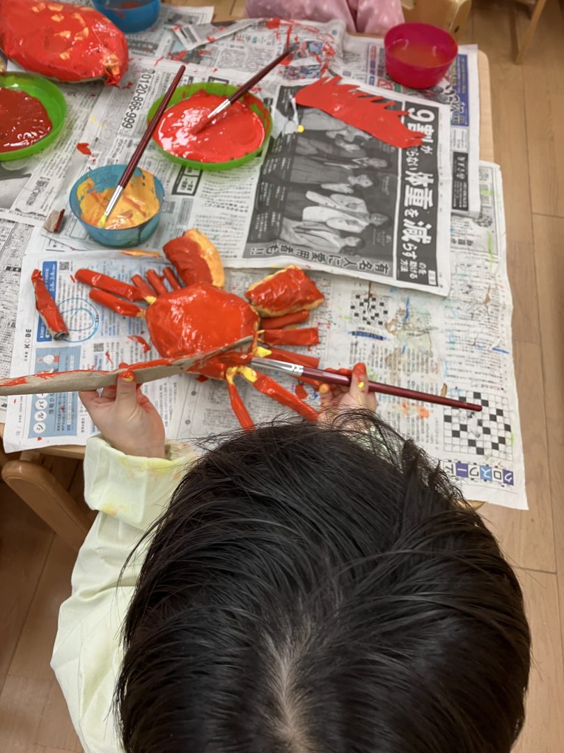 カニと魚を、色合いを考えながら絵の具で塗ることを楽しみました。