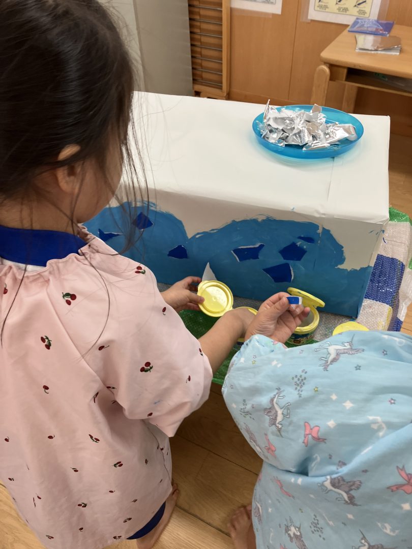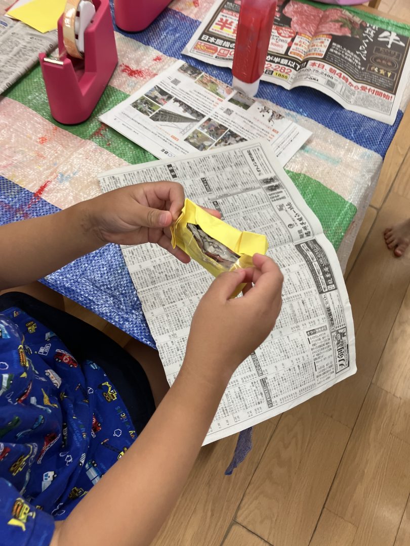 大好きなお寿司を思い出して、画用紙とテープで自由に作って楽しみました。