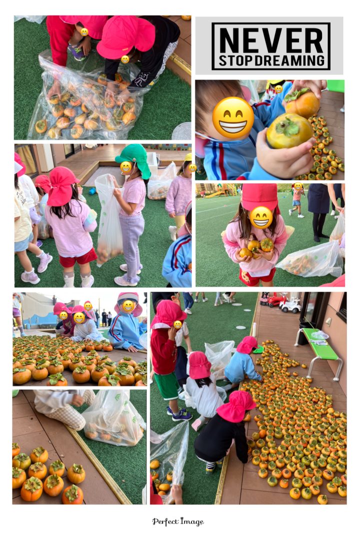 小さな手で柿をつかみ、「めっちゃたくさんある!」と大喜びでした。