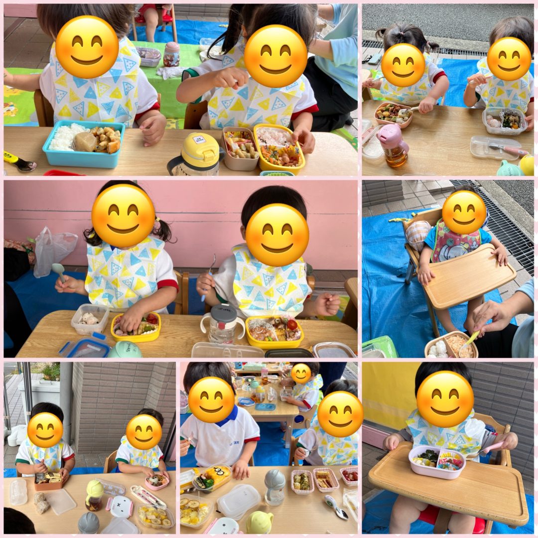 公園から帰ってきてから園のテラスでお弁当をみんなで食べました。
