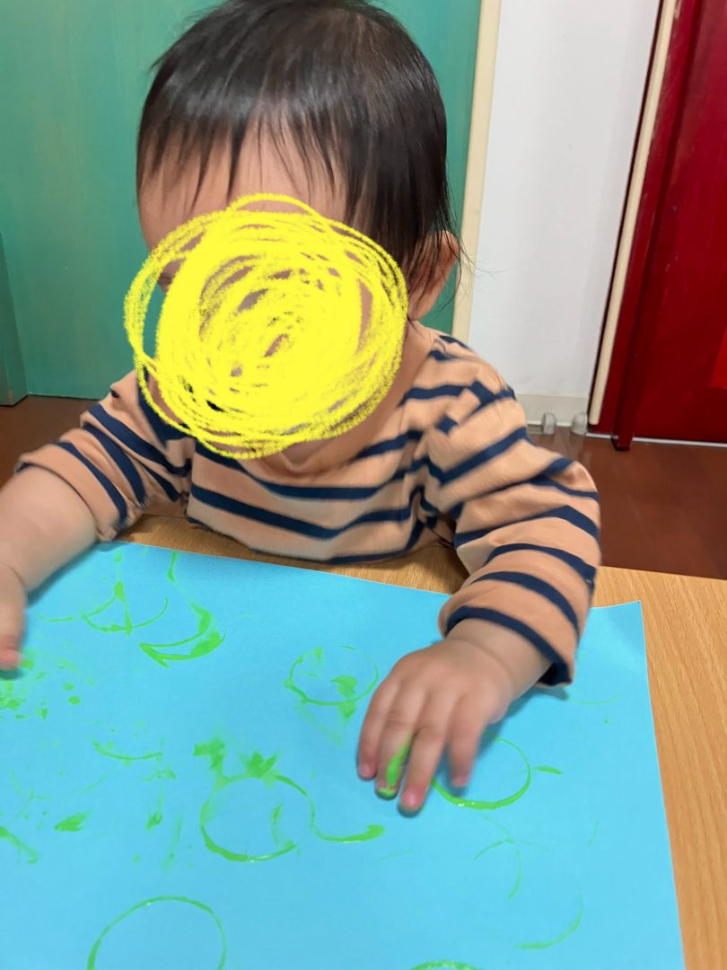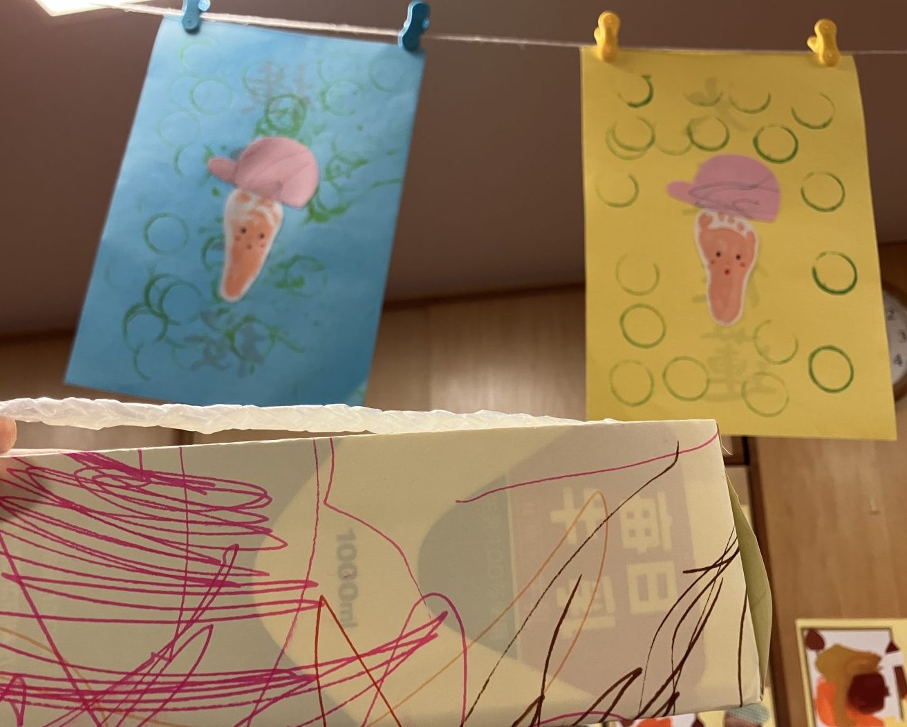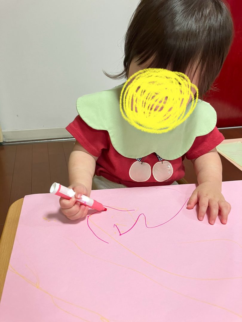 運動会ごっこの種目である果物狩りで使用するカゴはひよこ組さんの大好きなお絵描きを取り入れました。しっかりペンを持って描けていますね。