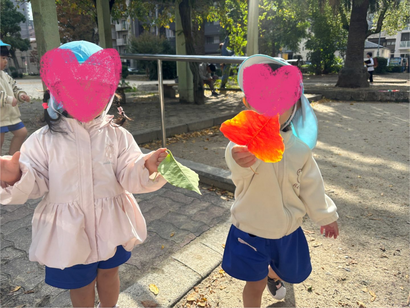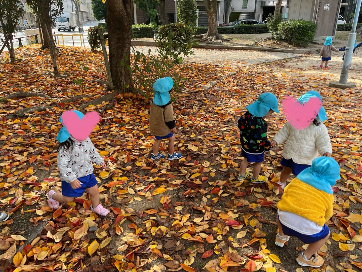 「みてー!赤ー緑ー」ととても嬉しそうに拾った葉っぱを見せに来てくれます♪