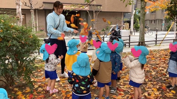 カラフルな落ち葉の上を嬉しそうに走って楽しんだり、落ち葉を集めて投げると「キャー!」と大興奮のうさぎ組です。