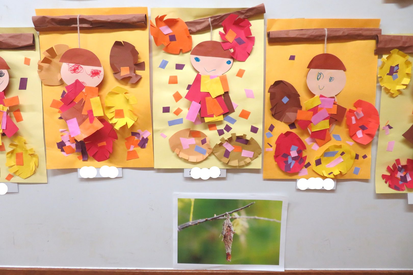 真ん中の羽の部分は新聞紙と折り紙をちぎって、糊で貼って表現しました!