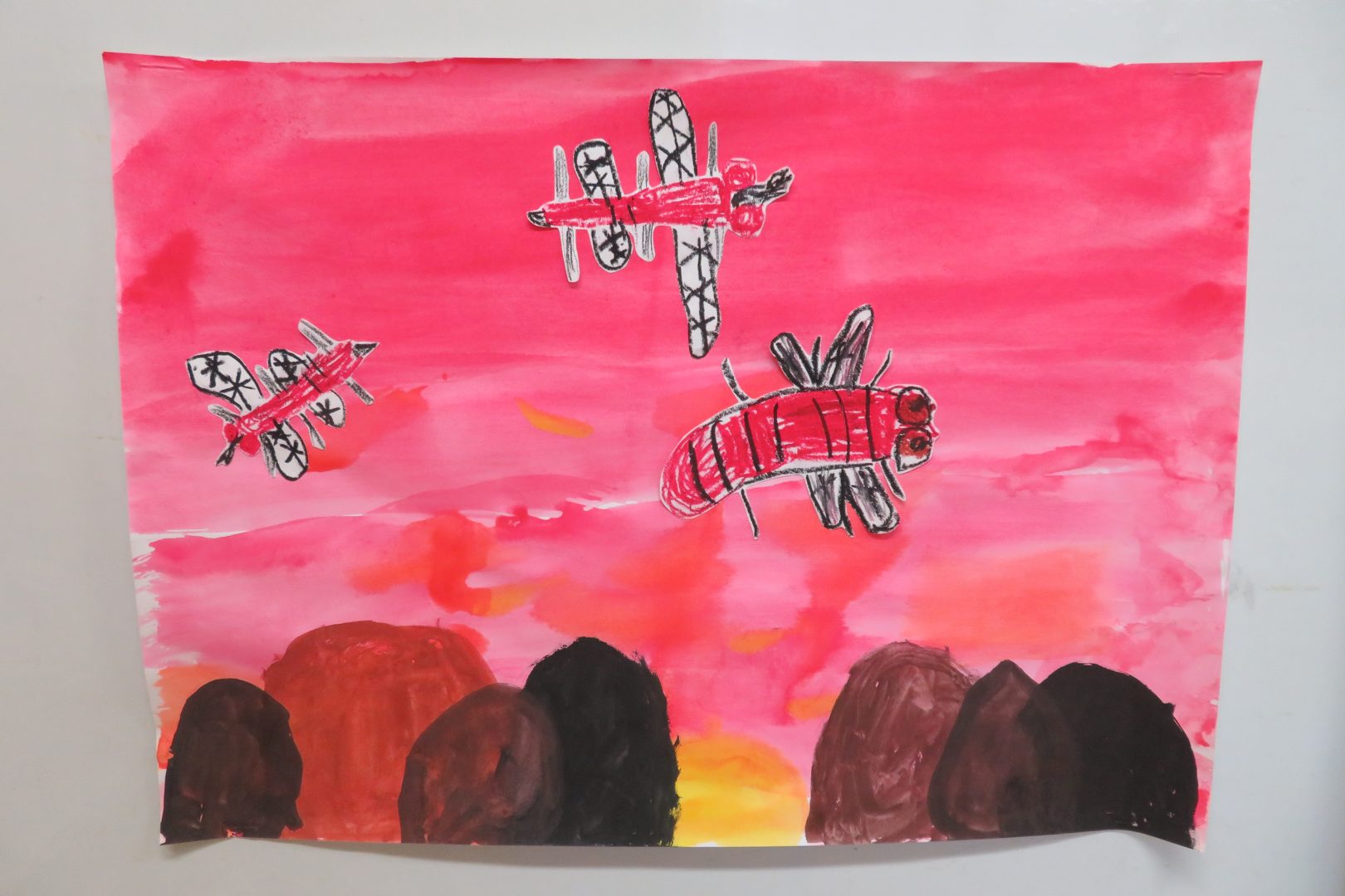 「赤とんぼ」の歌詞に出てくる、「♪ゆうやけこやけの赤とんぼ」をイメージして絵を描きました。