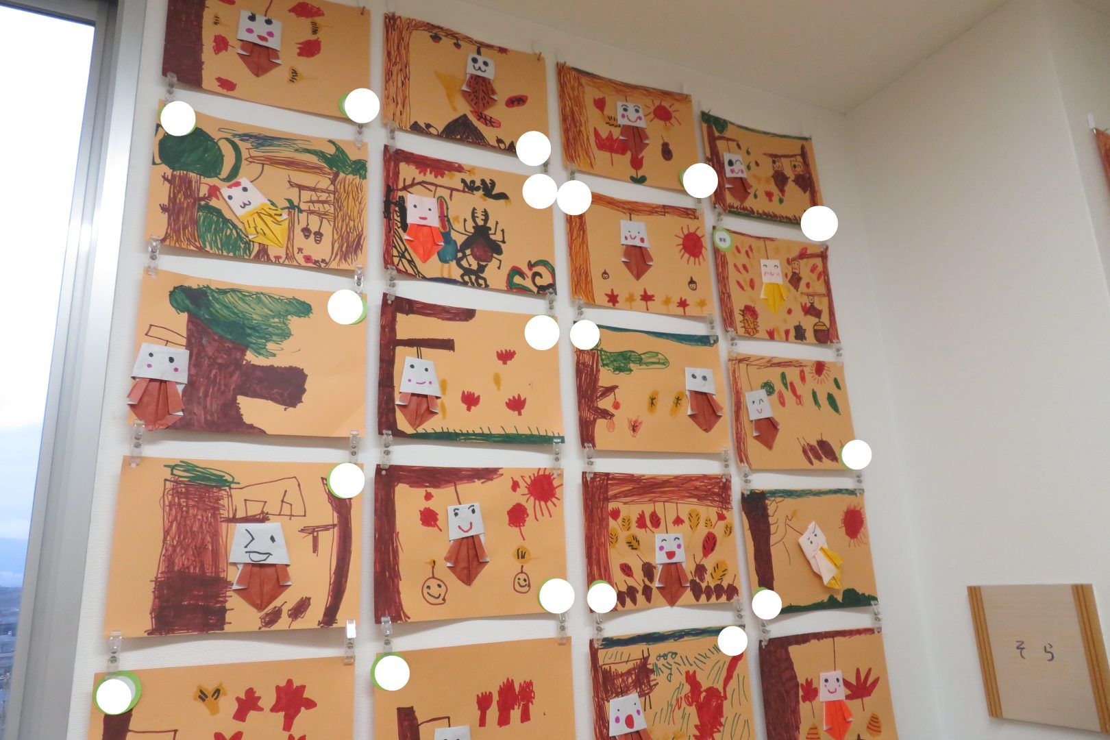 はさみの練習を始めたので、はさみで画用紙をたくさん切って、葉っぱのように散りばめました!