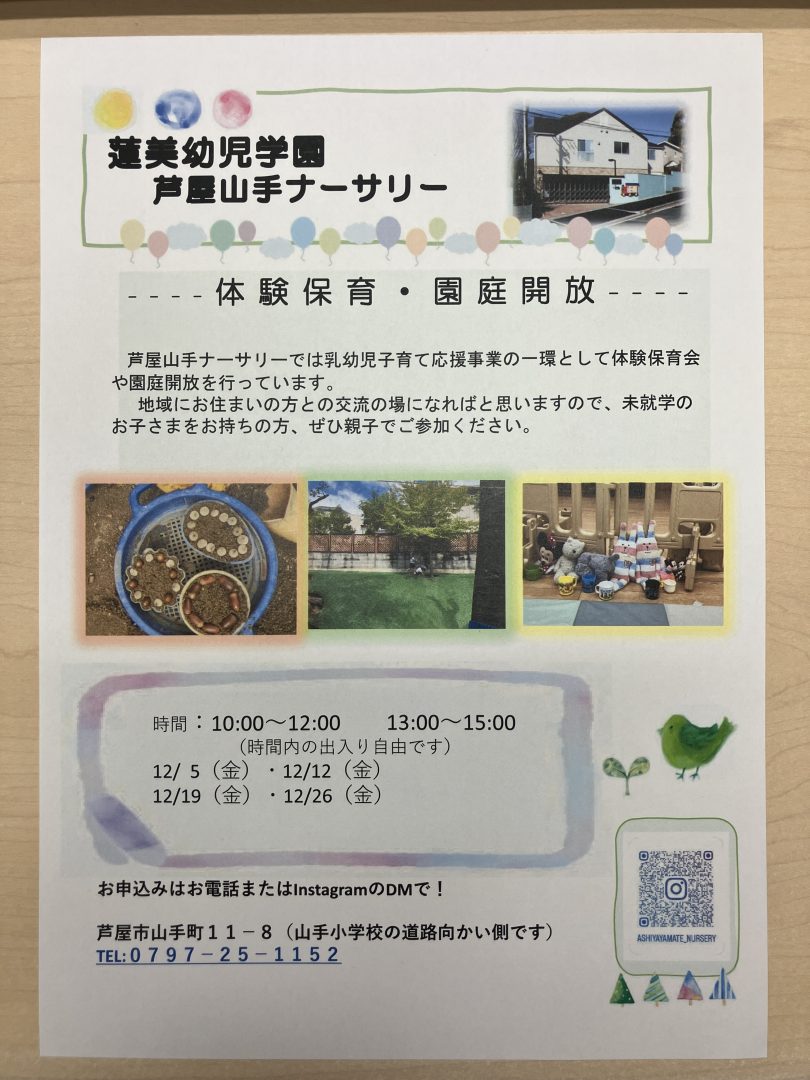 12月の園庭開放の日程をお知らせします。12月5日(金)、12日(金)、19日(金)、26日(金)です。19日は10時からお誕生日会にご参加いただけます。お電話にてご予約のうえ、お越しくださいね!
