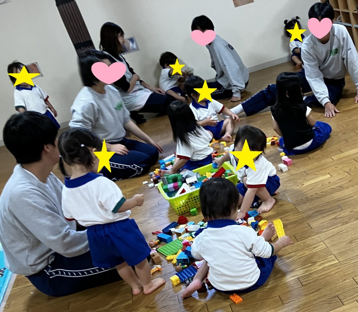 発表会の取り組みの様子を見てもらいました。「上手だね」と褒めてもらい、照れたり嬉しそうにする姿がありました。その後はカプラ積み競争なども楽しんでいましたよ。