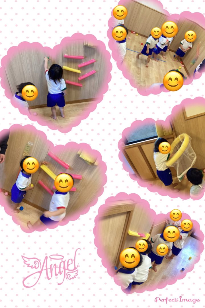 ボール遊びでは、プールスティックで作った斜面にボールを転がしたり、