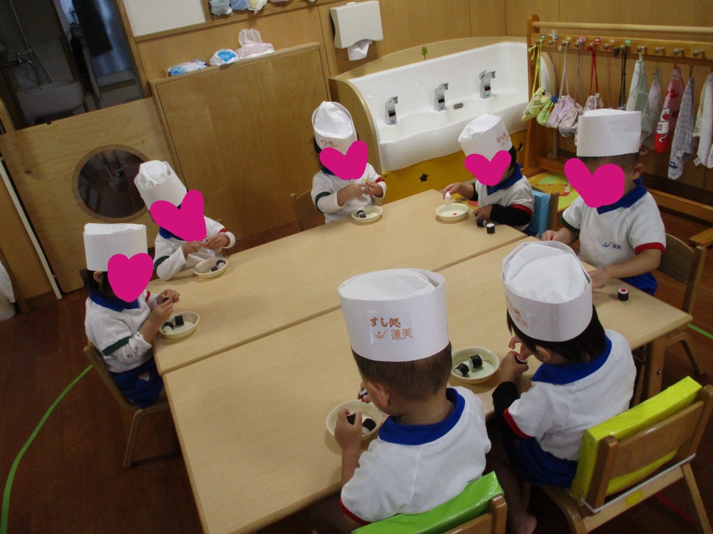 子どもたちには本格的にお寿司屋さんの帽子を被ってもらい、職人さんになってお寿司を作ってもらいました!