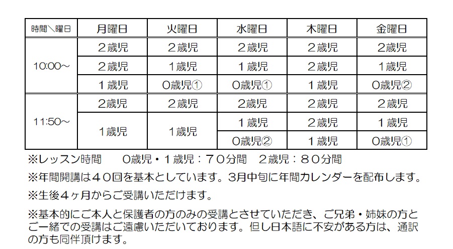 保護者の方にも一緒にレッスンを受けていただくことで、子どもの発達過程を理解し、大切な乳幼児期の子どもの関わり方の理解を深めていただきます。